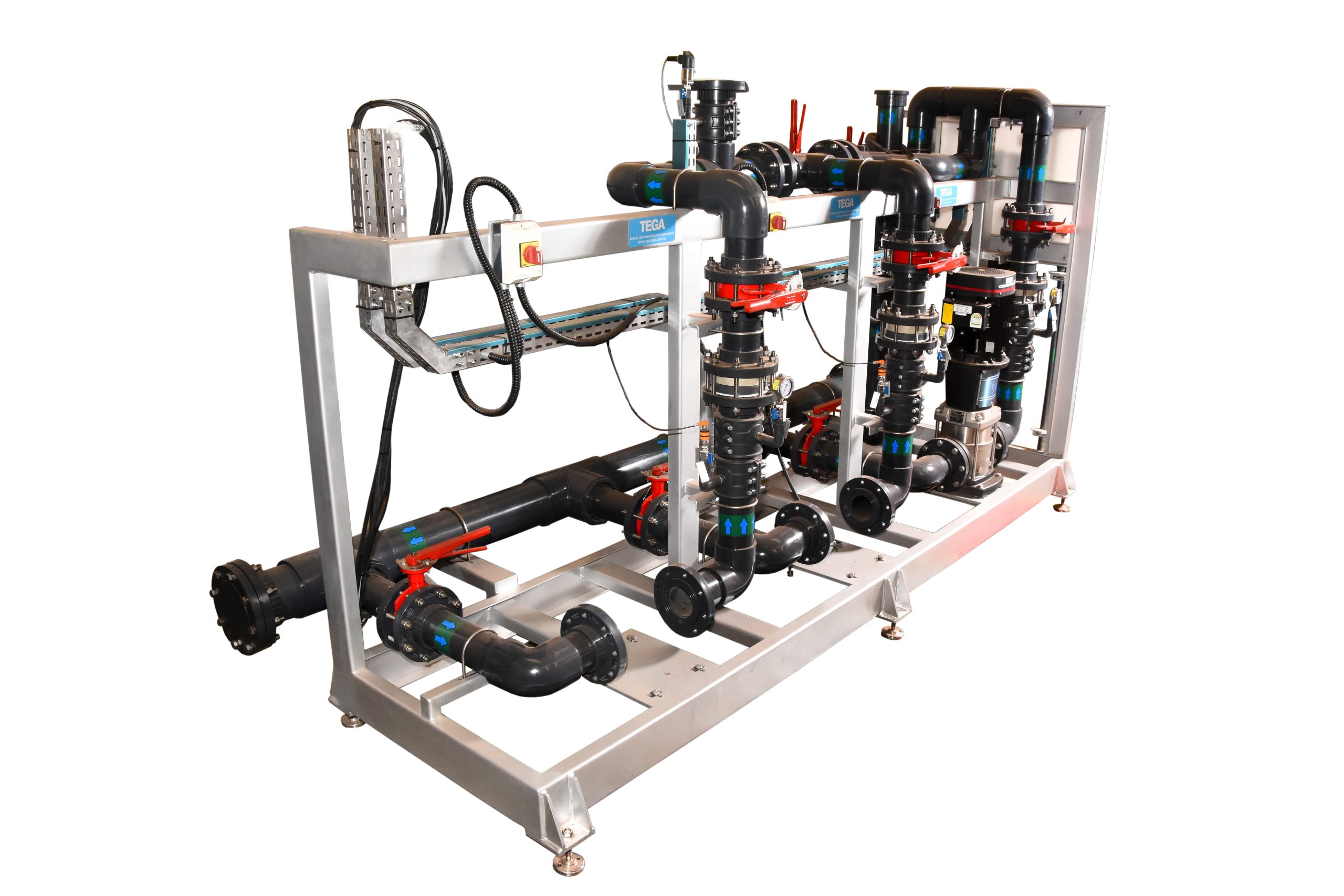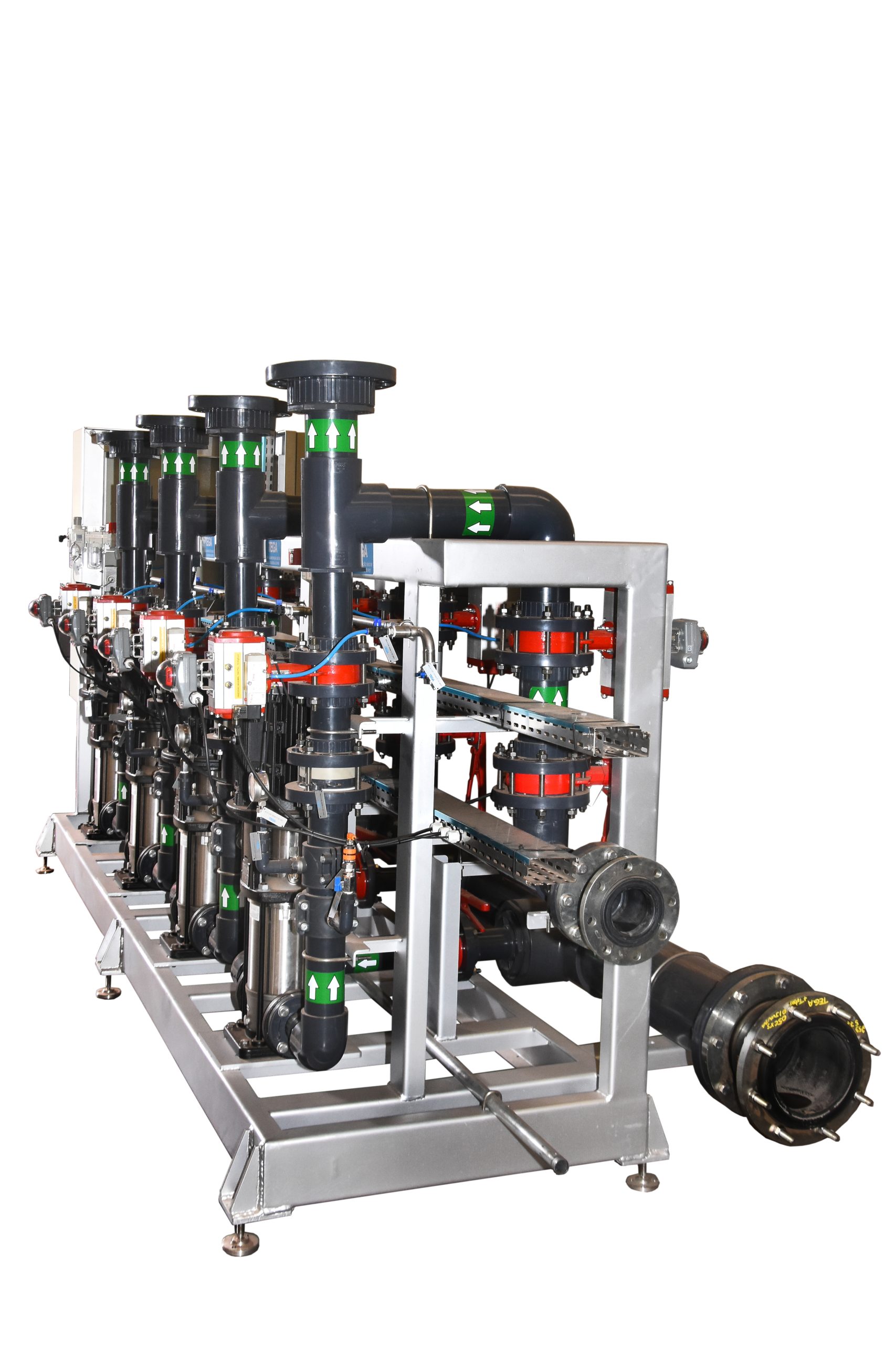 A solução foi concebida em formato SKID, com tubulações em PVC-U, vasos de pressão em PRFV (plástico reforçado com fibra de vidro) e estrutura em aço inox. Esse modelo garante maior flexibilidade, segurança operacional e facilidade de manutenção.